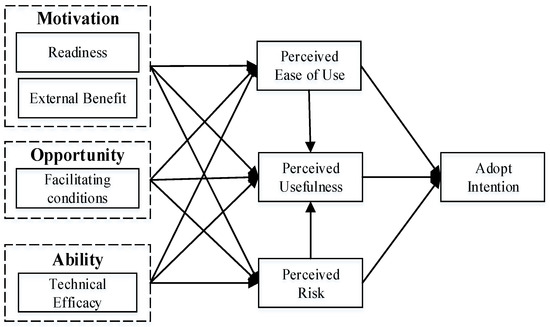 Technology Acceptance Model (TAM) was put forward by Ref. [28], based on the Theory of Reasoned Action, which explains and predicts individuals’ adoption or acceptance of computer information systems or information technologies. This model puts forward two main determinants: perceived usefulness and perceived ease of use. Perceived usefulness refers to the degree to which users think using a specific system can improve their work efficiency or performance, and perceived ease of use refers to the degree to which users think the system is easy to use [28]. Meanwhile, perceived ease of use strengthens perceived usefulness in specific situations [20]. Due to the simplicity, ease of operation, and strong pertinence of the model, TAM theory has been applied in many technical fields, and with a change of research objects, different extended versions of TAM have been extended [29,30]. The perceived risk theory is often integrated with TAM to study consumer behavior. The concept of perceived risk was first extended from psychology by Ref. [31] and advocated by many studies [32]. Uncertainty about the outcome implicit in an individual’s decision was defined as risk.