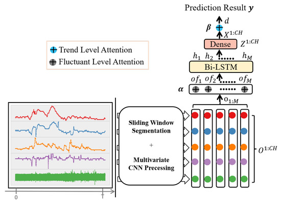 Given a time step t and an observation window W for the i-th intervention, this work takes the observed multivariate time series S ( t W , t ] (including both G ( t W , t ] and L ( t W , t ] ) as input, aiming to predict the output value of variable y i . With a pre-defined step size, S ( t W , t ] is first split into M equal length segments: s k , 0 k M (e.g., given a step with a length of 1 min, a high-frequency waveform segmentation g k of 125 Hz contains 7500 samples and a numerical waveform l k of 1 Hz contains 60 values). Next, CNN has been applied to these segments to obtain the convolutional output o k and the fluctuant level attention o f k , followed by a Bi-LSTM that transforms o f k into sequentially embedded vectors H and Z, and then a fully connected layer is adopted to convert Z into X. After that, this work makes use of the weighted average to integrate X = [ x ( 1 ) ,…, x ( C H ) ] (CH = |G| + |L|) across all channels to obtain the trend level attention d, which will be concatenated with t r ( k t ) ( 1 k t M 1 ) and used for prediction. Among them, t r ( k t ) = | ρ ( s k + 1 ) ρ ( s k ) | represents the difference between s k and s k + 1 , where ρ ( s k ) calculates the statistics of segment s k (i.e., max, mean or min). Specifically, to improve the model’s accuracy and interpretability, this study design a two-level attention mechanism (i.e., a fluctuant level attention and a trend level attention, denoted as α and β . Figure 2 depicts the framework of the proposed model.