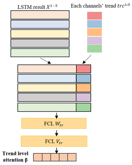 Trend Level Attentive Layer. The trend level attentive layer is designed to obtain a more comprehensive view of the multivariate signals, by fusing attentions across all the channels. First, a fully-connected transformation is performed on the LSTM feature map as follows: