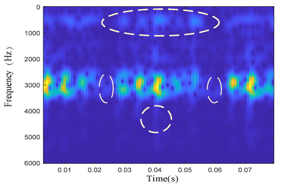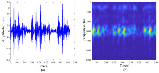 From the waveform of the raw vibration signal (Figure 6a) and the time-frequency analysis result (Figure 6b), periodic impulses were corrupted by strong noise.