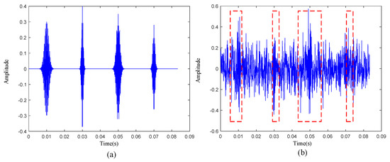 To restore the defective signal in the real scene, white noise with a signal-to-noise ratio of −6 dB was added to the simulation signal, and the time-domain waveform is shown in Figure 3b. According to the construction method of kurtosis-wavelet dictionary, we first set the window length to 50, moved the window without overlapping in the time sequence, and calculated the kurtosis value of each intercepted signal. The average kurtosis value of the 20-segment signal was 2.8476, and the specific positions of the 8-segment signals with kurtosis greater than the average kurtosis value are shown in the red dotted box in Figure 3b. We chose to set atoms at these positions. According to the comparison of Figure 3a,b, it can be seen that these atoms were placed in the positions of the transient pulses, which avoids noise.