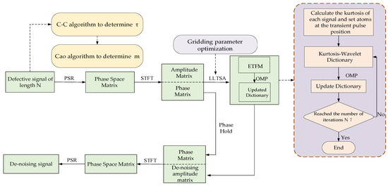 - Sparse representation: use the OMP algorithm to solve the sparse representation problem of ETFM and update the kurtosis-wavelet dictionary at the same time. The reconstruction result of the amplitude matrix is obtained by Equations (19) and (20). Then, the reconstructed amplitude matrix is combined with the phase matrix and restored to a one-dimensional signal by the inverse STFT and phase space reconstruction technology.