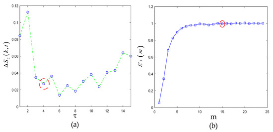 First, the C-C method and Cao’s method were used to jointly determine the embedded dimension and time delay in PSR. The change curve of with in the C-C method is shown in Figure 7a. It can be clearly seen from the red circle in the figure that when was 4, took the first local minimum value. Therefore, it can be determined that the optimal solution of should be 4.