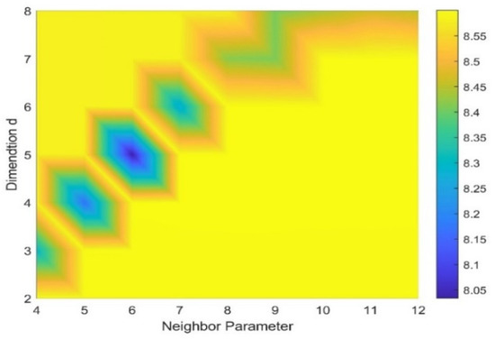 After PSR, we chose the time-frequency manifold learning algorithm LLTSA to further mine and de-noise the high-dimensional space of the signal. The Renyi entropy value of TFM obtained by LLTSA was calculated by using the gridded parameter search method. The specific results are shown in Figure 8. It can be clearly seen that when d = 5 and k = 6, the ETFM with the smallest Renyi entropy was obtained.