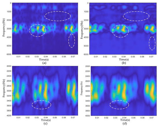 The comparison between the time-frequency diagram of the raw signal and the ETFM is shown in Figure 9a,b. As marked in the figure, the low-dimensional manifold time-frequency diagram was completed to retain the transient pulses of the raw signal in the 3000 Hz resonance band, and there was also a certain noise suppression effect in the resonance band and other frequency bands. As seen from Table 3, compared with the raw signal, the Renyi entropy value of ETFM was much smaller, which proves that the noise suppression effect of the time-frequency manifold algorithm was powerful. Compared with the Renyi entropy of LLTSA-TFM and LTSA-TFM without optimization, ETFM also had advantages, which proved the effectiveness of the parameter optimization method on the basis of grid search. Figure 9c,d, shows the enlarged comparison of the ETFM and the LTSA-TFM near the resonance band. Both algorithms can effectively retain pulses in the resonance band of 3000 Hz. However, from the places marked in the figure, it can be clearly seen that the pulses in ETFM were more independent and obvious than that in LTSA-TFM.