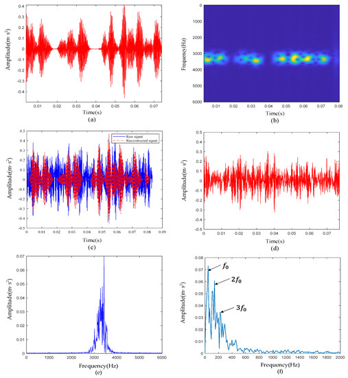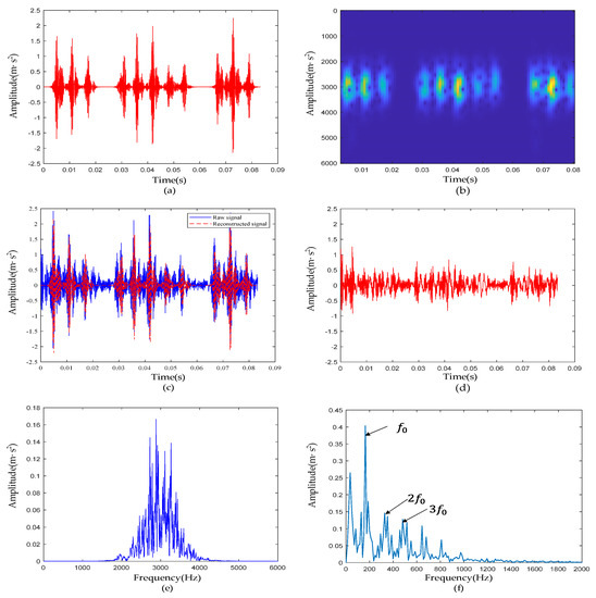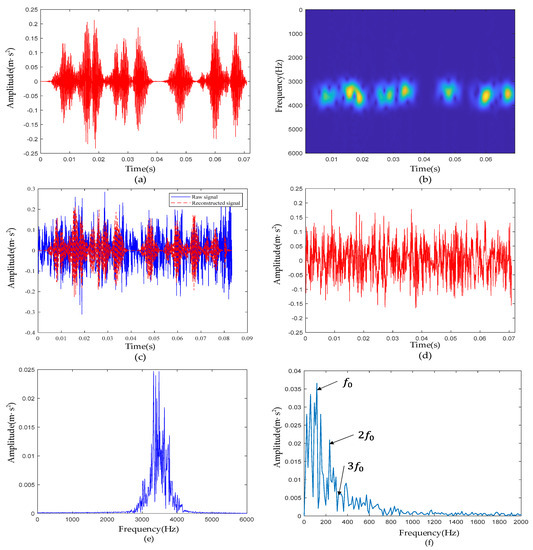 Figure 12a is the waveform of the reconstructed signal. Figure 12b is the time-frequency diagram of the reconstructed signal. Compared with Figure 11b, the noise outside the resonance band was essentially filtered out, and the impulses between 3000 Hz and 4000 Hz were reconstructed. From the comparison of the reconstructed signal and the raw signal and the residuals of the two, it can be seen that most of the noise between the impulses did not appear in the reconstructed signal. According to Table 1, the characteristic frequency of the outer-race defective signal was 105 Hz. In Figure 12f, and its harmonic are clearly visible; was not clear and was affected by harmonics and noise.