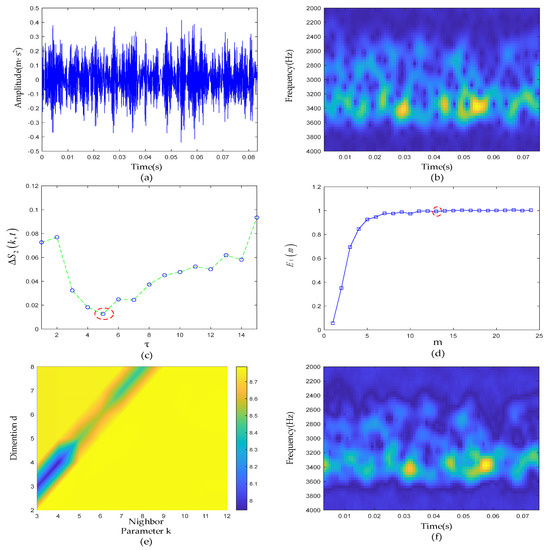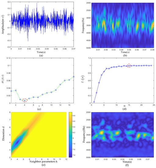 In this subsection, we analyze the outer-race defective signal. Due to the existence of strong background noise, no obvious defective transient characteristics could be seen on the raw signal time-domain waveform and time-frequency diagram. First, the parameters of PSR were determined jointly by the C-C method and Cao’s methods. As shown in Figure 11c,d, it can be clearly seen that when was set to 4, took the first minimum value. Then, taking as 4 as the input of Cao’s method, the relationship between the E1 value and m was obtained. When m was greater than 15, the E1 value remained basically unchanged. Therefore, the phase space embedding dimension m of the measured signal finally took the value of 15. In the time-frequency manifold reconstruction, the input parameters of the LLTSA algorithm were determined according to the grid search method. The specific results are shown in Figure 11e. When d = 4, and k = 4, the Renyi entropy was the smallest. The time-frequency diagram of the ETFM is shown in Figure 11f. Compared with Figure 11b, it can be seen that the manifold learning algorithm had a certain degree of noise suppression effect, and the transient pulses in the time-frequency diagram was clearer, highlighting the defective characteristics.