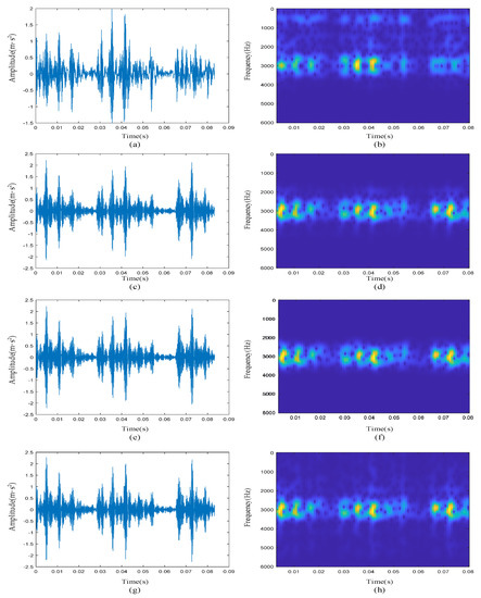 - The filtering effect based on the EMD algorithm is shown in Figure 16g,h, and the IMF whose center frequency was approximately 3000 Hz was selected as the reconstructed signal. It can be seen from its time-frequency diagram that the reconstructed signal contained considerable noise because the EMD algorithm had bandpass filtering characteristics for white noise.