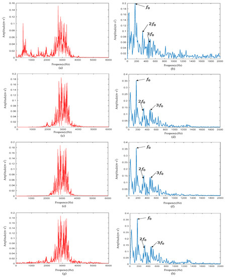 (a) Signal spectrum obtained by DWT; (b) signal envelope spectrum obtained by DWT; (c) signal spectrum obtained by CWT; (d) signal envelope spectrum obtained by CWT; (e) signal spectrum obtained by WPT; (f) signal envelope spectrum obtained by WPT; (g) signal spectrum obtained by EMD; (h) signal envelope spectrum obtained by EMD.