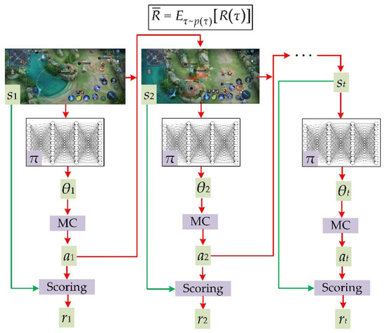 where p(s1) is the probability of state s1 when taking no actions, p(at|st;θt) is the probability of the state–action pair (at|st) under the guidance of game policy θt, and p(st+1|st,at) is the state transition probability from st to st+1 under the condition of action at. Moreover, the game policy θt is the parameter of probability distribution p(at|st;θt), thus p(τ) is a function of θt. Note that p(st+1|st,at) and p(s1) are determined by the game system and independent of θt, and θt is a continuous output of DNN π. Thus, p(τ) is a continuous function of θt, and the gradient of the expected reward is valid. Given Equation (2), the expected reward of an episode τ can be expressed as: