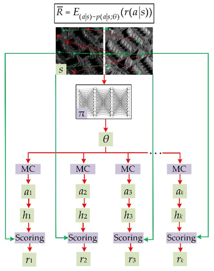 DRL can be applied to solve the mismatch removal problem. As illustrated in Figure 2, the state s can be viewed as the initial matched point pair set between stereo images; the policy DNN π is a classification network which outputs a relative matching probability (RMP) for every matched point pair (RMP is analogous to the game policy θ, here we continue to use θ to denote RMP); action ak means sampling a subset from the matched point pair set s, which is used to generate a hypothesis hk; reward rk is the score of the state–action pair (ak|s) based on the hypothesis hk. The hypothesis is that matching inliers conform to the transformation model, which was calculated via the sampled subset and a geometric model solver (e.g., the fundamental matrix computed by the eight-point algorithm), while matching outliers were not in accordance with the model.