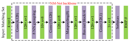 We added a softmax operation after NM-Net, as the network π is expected to output RMP for each matched point pair; the detailed network architecture used in ULMR is shown in Figure 3. For a matched point pair set that consists of n matched points, the network output an n-dimensional vector θ = (θ1, θ2, …, θn) indicating the matching reliability. Note that ULMR is a universal framework for unsupervised learning of mismatch removal, and it can be integrated with other classification networks such as PointNet or LFGC, which can be seen in the ablation experiments.