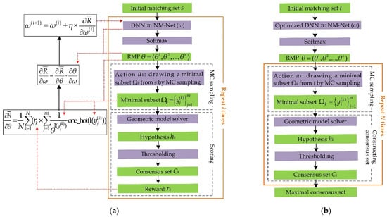 The training pipeline of ULMR is shown in Figure 4a: the input was the initial matching set without labels, and NM-Net outputs RMP for every matching pair; then, depending on the RMPs, the MC algorithm (Algorithm 1) was applied to sample a subset consisting of m point pairs from a categorical distribution parameterized by RMPs (Equations (7) and (8)); next, the sampled subset was fed to a geometric model solver to generate a hypothesis; finally, by thresholding the back-projective error (e.g., symmetric epipolar error), we obtained a consensus set, with the element number of the consensus set as the reward (Equation (9)). In the above process, Equations (10)–(12) can be computed, and the optimal parameters ω of NM-Net can be obtained by the training iterations. Note that the optimal NM-Net was not used directly to distinguish outliers, since there is no reliable threshold of RMP to separate inliers from outliers. As depicted in Figure 4b, based on the optimized NM-Net, Algorithm 1 was repeated N times to generate N subsets and estimate their corresponding hypotheses; then, N consensus sets were obtained based on the thresholding; finally, the maximal consensus set with the most elements was considered as the outlier free matching set.