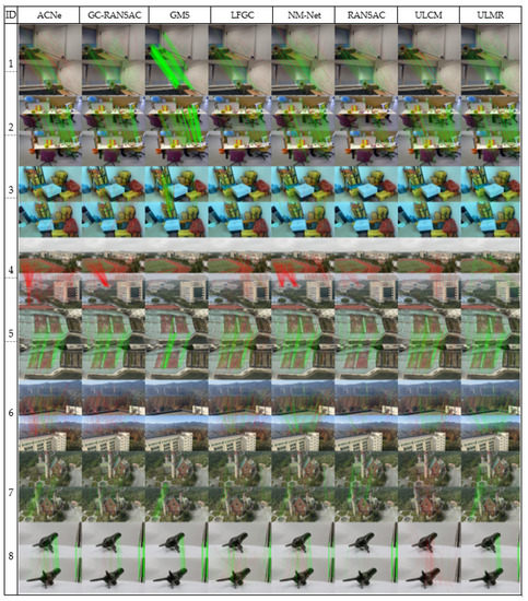 For GMS, ULCM, NM-Net, LFGC, and ACNe, their purified results had lower precision and numerous matching outliers (as shown in Section 3.3), causing degenerated configuration when using eight-point algorithm to estimate fundamental matrices. Therefore, a RANSAC-embedded eight-point algorithm was applied instead. Nevertheless, we used pure ULMR for the application.