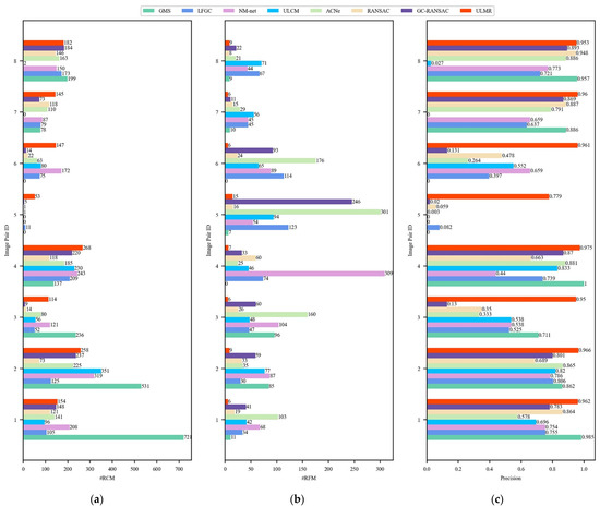 Quantitative mismatch removal results of real scenario images. (a) #Precision; (b) #RCM; (c) #RFM.