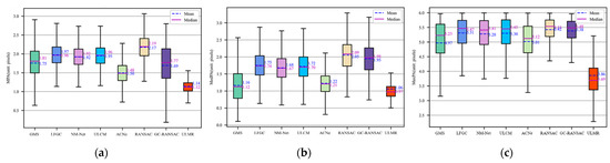 Figure 7 shows that pure ULMR obtained the most desirable results among the above methods. First, ULMR achieved the greatest stability; as shown in Figure 7a,b, ULMR had the lowest box heights, indicating smaller fluctuations of MPA and MedPA. Second, ULMR had the best accuracy; as illustrated in Figure 7a,b, its mean MPA, median MPA, mean MedPA, and median MedPA were all the lowest. Third, the remaining matches obtained by ULMR had the highest quality; as shown in Figure 7c, the MaxPA of ULMR had the lowest upper bound (5.25 pixels), and the smallest mean MaxPA (3.69 pixels) and median MaxPA (3.86 pixels).