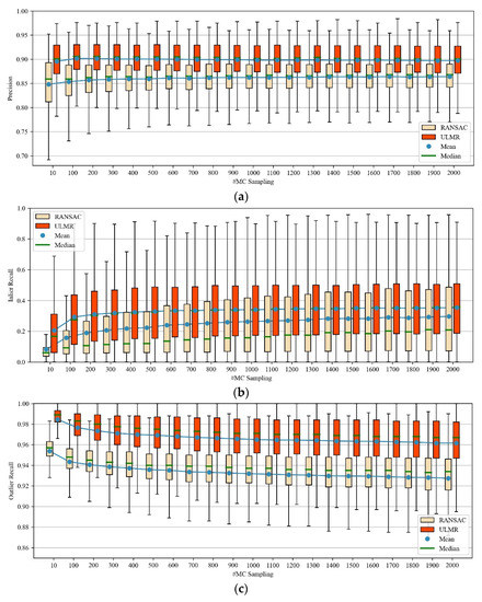 We scrutinized how precision, inlier recall, and outlier recall varied with the sampling number; the compared results of ULMR and RANSAC are illustrated in Figure 8.