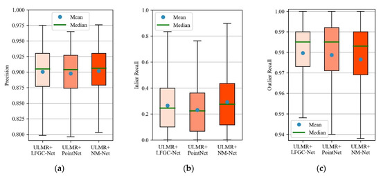 It can be seen from Figure 9 that the three integrated methods all achieved excellent precision, inlier recall, and outlier recall, which shows the high compatibility of the proposed ULMR framework with other classification networks. ULMR + NM-Net performed slightly better than ULMR + LFGC-Net and ULMR + PointNet, because NM-Net aggregates more global and local information than PointNet or LFGC-Net [22].