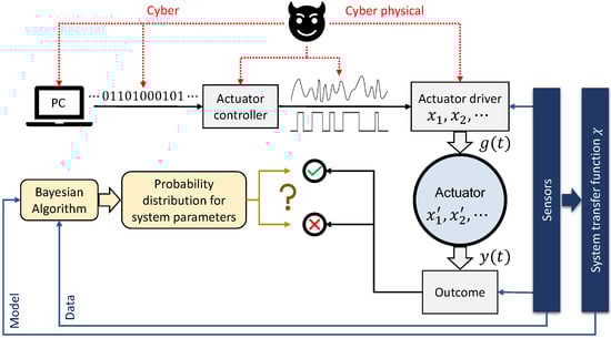 The Bayesian formalism offers a principled path to a unique answer for such a well-posed problem []. In our case, we assume an attack surface covering the input signal to the actuator (parameters in Figure 1), but take the actuator itself as characterized and secure; we make this assumption for clarity in the proof-of-principle examples here, but the approach can readily be extended to arbitrary system parameters. Then, the probability density given the N datapoints in follows Bayes’ theorem as