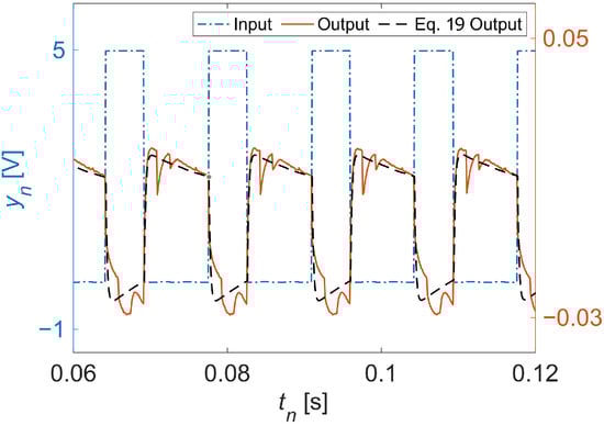 Dynamics of the studied actuator. Shown are the experimentally measured output signal, which is the actuator response to a periodic square-wave input signal, and the simulated output of Equation (19) given the same input signal.
