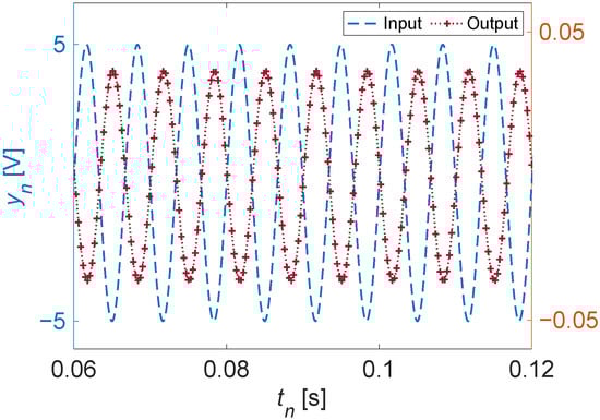 Alternatively, we may numerically determine the corresponding transfer function using measurement data acquired from our experiments. For our system’s input and output signals, we selected, respectively, the PWM control signal and coil current flow from a single phase of our testbed’s motor. We recovered both signals as voltage measurements due to the use of a passive current transducer on the coil lead. Both the measured input and output data are shown in Figure 2. Using this data, we could numerically obtain a transfer function with a polynomial optimization algorithm []. Given the theory behind Equation (13), we chose a generic second-order fit for of the form: