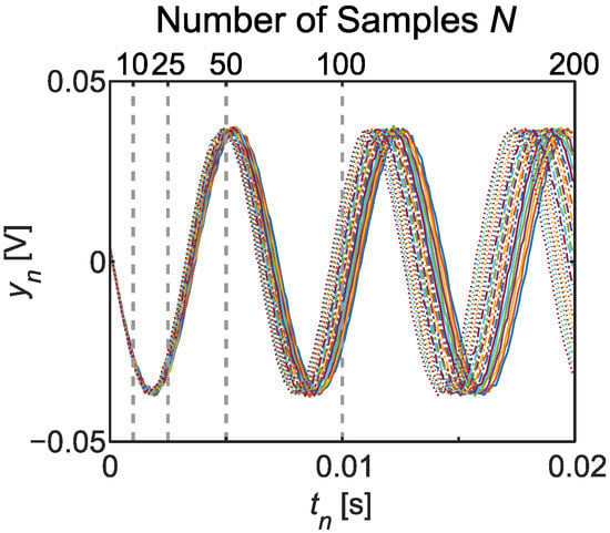 We simulated the output for input sinewaves of varying frequencies from 140 to 160 Hz, with a sensor sampling rate of 10 kHz (s) and output noise standard deviation of mV. Plots of all data vectors appear in Figure 4. Each curve corresponds to a specific ground truth frequency Hz (see legend in Figure 5). Dotted vertical lines delineate the different sample sets considered for inference; e.g., signifies that the first 10 samples starting with s were included, and that all 200 samples from 0 to 20 ms comprise . Thus, a total of 105 MCMC inference results were separately obtained, accounting for all five values of N and 21 frequencies.