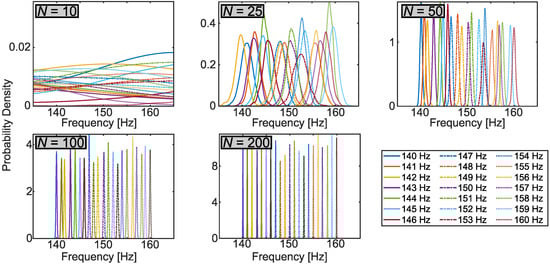 For the prior, we took kHz (the maximum non-aliased frequency for 10 kHz sampling by the Nyquist theorem) and mV to fully encompass the voltage scale in our system. We kept samples from a total chain length of , where the thinning factor of was found sufficient empirically to ensure that all parameter means and variances had converged to final values. The sample sets allowed estimates of any of the four parameters ; yet for the purposes of this test, we focused on frequency specifically. Taking the R samples obtained for each dataset, we computed an estimate of the marginal probability density for frequency using the built-in kernel smoothing function in MATLAB []. Figure 5 plots all 21 probability densities for each sample number N as a function of cyclic frequency . While the case returned extremely broad distributions that were on top of each other (a consequence of insufficient data to identify frequency), clear peaks appeared for just samples; at , the distribution peaks increased monotonically in accordance with the ground truth values; and for , all distributions were clearly separated at sub-Hz precision levels.