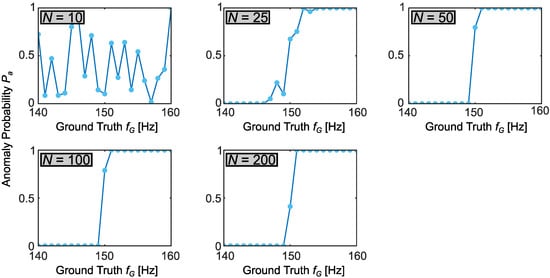 Anomaly detection curves for each sample number N. The anomaly probability is the Bayesian-inferred probability that the excitation frequency exceeds 150 Hz, plotted against the ground truth frequency.