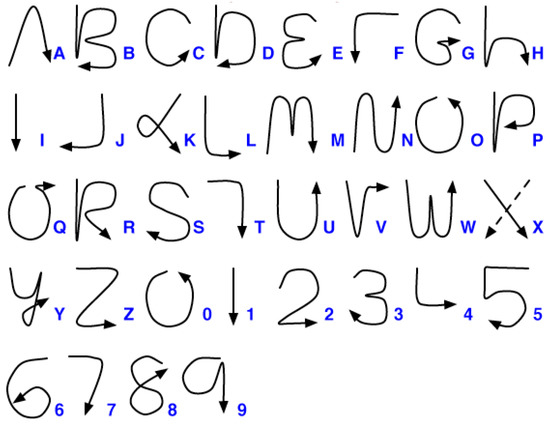 - Graffiti (Palm OS). Available online: https://en.wikipedia.org/wiki/Graffiti_%28Palm_OS%29#/media/File:Palm_Graffiti_gestures.png (accessed on 8 June 2022).