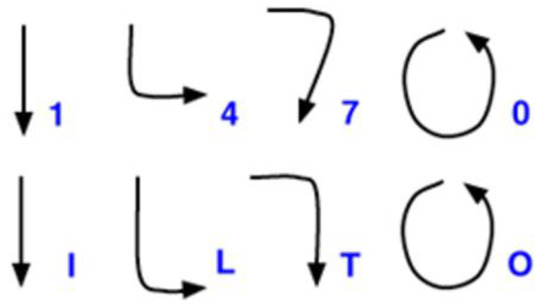 The gestures of some characters are the same or slightly different (see Figure 4). The gestures of Arabic numerals “0” and “1” are the same as the gestures of letters “O” and “I,” respectively; the gestures of “4” and “7” are very close to that of “L” and “T,” respectively. Each of the 36 characters were recorded five times by each participant, but the patterns with similar shapes were categorized as a single class during the pattern recognition phase. Therefore, the number of classes of gestures used in the experiment was 32.