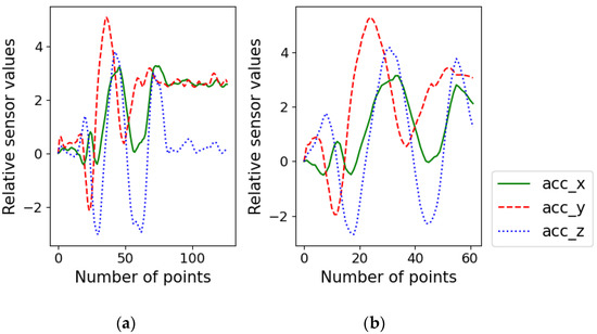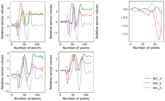Examples of normal and corrupted signals of the accelerometer are shown in Figure 7. The accelerometer values were adjusted (shifted along the y axis) such that the value at the beginning is zero.
