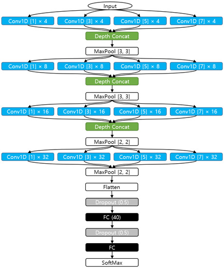 The proposed network model with inception architecture [19], inspired by GoogLeNet [20], is shown in Figure 9. The two-dimensional (2D) convolutions are substituted by 1D convolutions and the inception modules of GoogLeNet were simplified for our purposes. The inception modules are expected to extract features in different frequency levels. Different sizes of convolutions were located parallelly and the results were concatenated into a tensor after the convolutions. The sizes of the convolution filters are 1, 3, 5 and 7. The number of filters is 4 for the first inception module, and the numbers of the succeeding modules are 8, 16, 32 and 64.