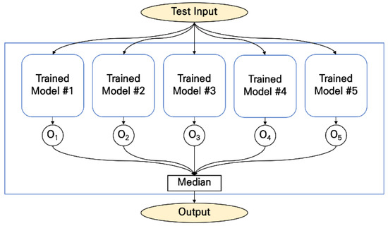 The accuracy of artificial neural networks may vary because of the randomness of the training algorithms, especially when the size of data is small. We employed an ensemble model to stabilize and increase the overall accuracy [21,22]. We trained five different models in the training phase and calculated the median values from the five outputs to derive the final output (see Figure 10).