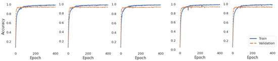 Ninety models were trained during the experiment as the five trained models were utilized for each fold. Figure 11 shows the training and validation curves when we trained the same structure of the proposed model five times. The curves of the five models had similar trends. The accuracies of the training and validation increased sharply during the first 100 epochs and were stable after the 200th epoch.