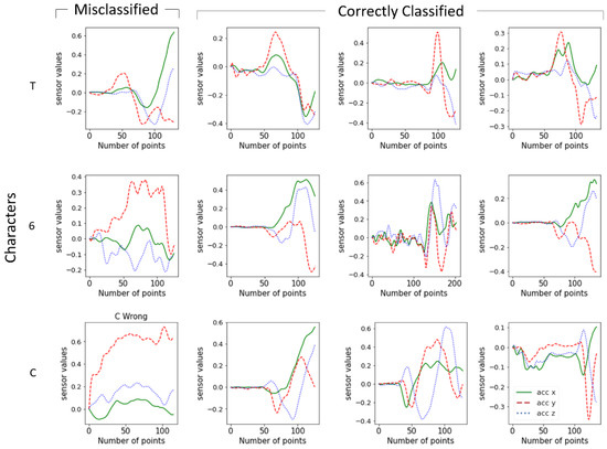 Figure 13 shows the misclassified signals of characters together with the correctly classified signals. The misclassified characters generally showed different signal trends. For example, misclassified T and 6 had additional movements in the Y-axis in comparison to the correctly classified characters. This can be caused by unexpected wrist rotation during the air writing or a loosened strap meaning the watch moved freely during the air writing. Some signals were completely different signal shapes as shown in the signals of C. It is expected that the participant may have moved their arm in the wrong direction during the air writing.