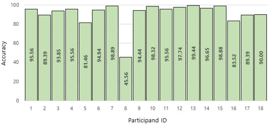 Accuracies also varied according to the participants (see Figure 14). The accuracies of the 13 participants were higher than 90%; four participants had accuracies between 80% and 90%, and one (participant #8) had 45.56%, which is approximately half of the average. The reason for this low accuracy is possibly a different method of hand/arm movements during air writing. Accuracy may increase with additional training data for various postures.