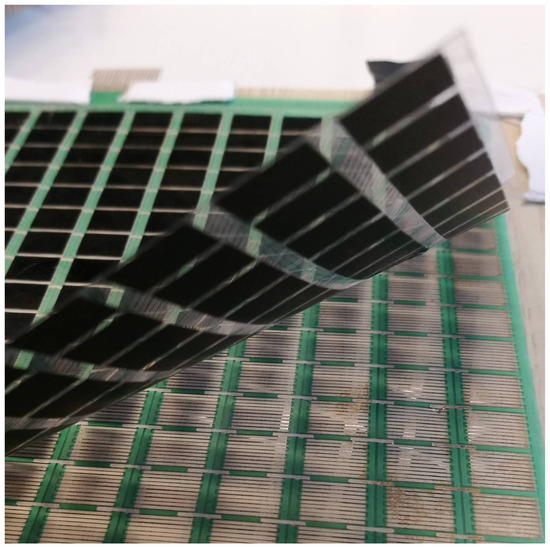 36]. The entire sensor matrix comprises 512 sensors organised into 16 rows and 32 columns. Each comb electrode placed under the graphene FSR field comprises two parts. One part is connected to all the electrodes in a row and the other to all the electrodes in a column. The pressure of the graphene field on the electrodes makes them conductive. By measuring the resistance between the selected rows and columns, the location can be determined and the value of the touch pressure exerted on the FSR matrix can be estimated.