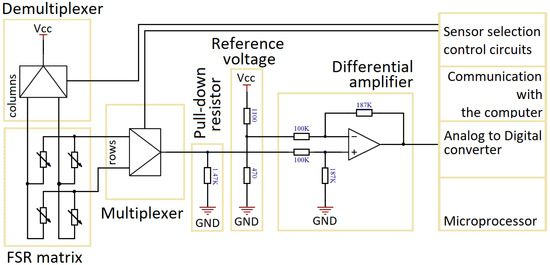 Figure 2). In the developed system, the matrix of sensors is connected via an analog demultiplexer connecting the supply voltage to the selected column. An analog multiplexer connected to each row allows to select a single FSR resistance measurement. A pull-down resistor connects the FSR to the ground, allowing the test current to flow through it. The difference between the voltage across the pull-down resistor and the reference voltage is amplified and fed to the analog–digital converter.