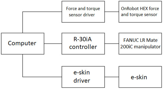 The measurement acquisition setup consists of the FANUC LR Mate 200iC manipulator, the R-30iA Mate manipulator controller, the e-skin with a driver, the OnRobot Hex-e 6-axis force and torque measuring device with a controller, and a general purpose PC. The general connection diagram of the calibration setup devices is shown in