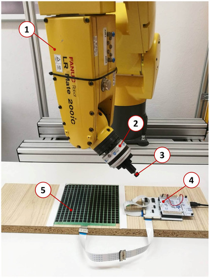 The Hex-e device is compatible with the Fanuc LR Mate 200iC manipulator wrist. This made it easy to integrate the Hex-e device on the manipulator. A dedicated tool made using a 3D printing technology (FDM) was further bolted to the force sensor. A pressure spring was installed in the manipulator tool construction due to the build-up of force exerted on the e-skin because the displacement of the tool tip is slower. This allows better control of this force by the displacement of the robot tool tip. This is important because graphene-based FSRs are usually highly sensitive to the low force exerted on them. In a situation, as in the designed test setup, where control of the force exerted on the e-skin is indirectly achieved by displacement, it is necessary to significantly slow down the displacement of the tool tip in order to acquire a large number of measuring points for low contact pressures. By lowering the stiffness of the closed kinematic chain created when the tool tip contacts the e-skin surface, a greater number of measurement points can be acquired for a minimum manipulator movement speed than would be the case with a rigid tool. Furthermore, by using a linear velocity of the manipulator movement, it is possible to achieve a linearly increasing force exerted on the e-skin. This can be an important factor in calibration.