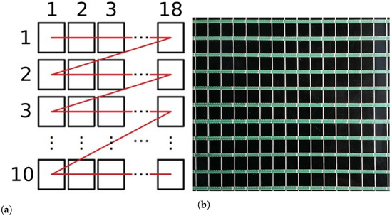 After the calibration of coordinate frames, the measurements of the e-skin were performed. The industrial robot was programmed to move above the e-skin matrix and sequentially position the tool above each of the e-skin sensors from the subset being analysed (10 rows × 18 columns). Robot trajectory is illustrated in