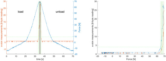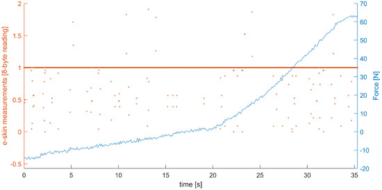 Figure 10. It can be observed that the force exerted on the e-skin sensor by the robotic arm, corresponding to the threshold level, is around 40 N for this sensor. This force threshold is not consistent for all the e-skin sensors, however. The variability of this parameter influences the sensitivity of the e-skin as a whole. It also makes it difficult to predict the e-skin behaviour at the low level of force applied.