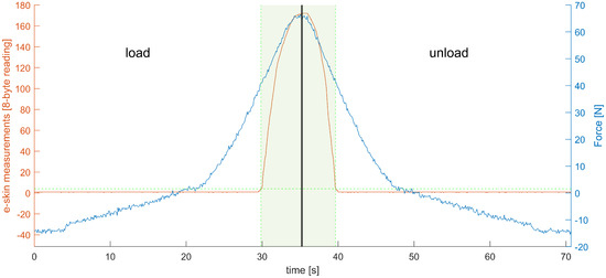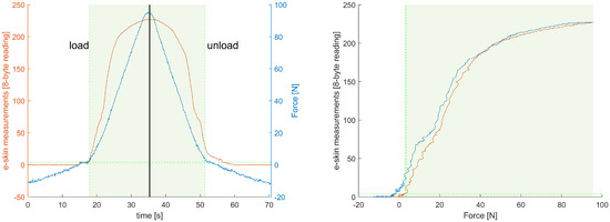 Figure 14, it can be observed that the force measured by the reference Hex-e sensor passes through the zero point 0 N at a certain moment in time. This is due to the measured gravitational force exerted on the robot tool even before the tool tip contacts the e-skin surface. We can see the effect in both the load and unload phases.