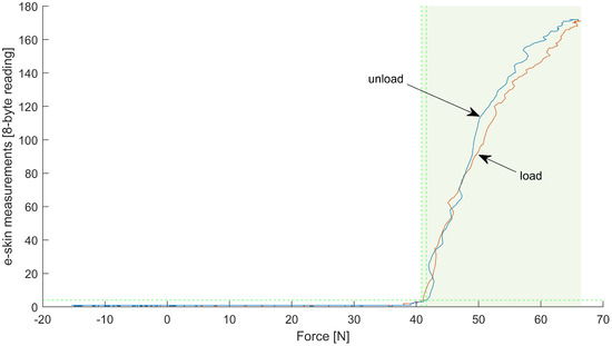 Figure 9. Both the ‘loading’ and ‘unloading’ phase are shown. It can be observed that there is some threshold value below which results obtained from the e-skin sensor are near-zero.