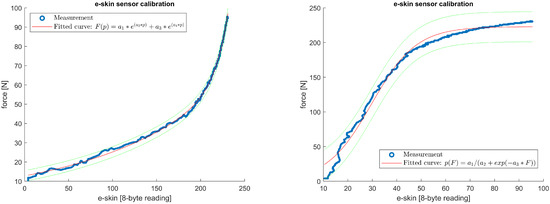 It is worth noting that the high variability of parameters such as in practice can pose a significant problem when trying to estimate exerted force F based on touch pressure p. In contrast to the e-skin sensors’ measurement nonlinearity, this cannot be compensated for using different fitting characteristics.