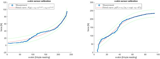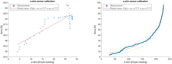 1) to estimate exerted force values from touch pressure sensor measurements for individually defined parameters. This is represented by substantial variability in parameters such as maximum exerted force, exerted force insensitivity threshold, or range of measured touch pressure for sensors on the e-skin surface. A significant advantage of the presented procedure is the considerable automation—the full process of acquiring measurement data to calibrate only a subset of the e-skin sensors takes approximately 4 h. Thanks to the proposed robotic procedure, a human did not have to deal with this tedious task.
