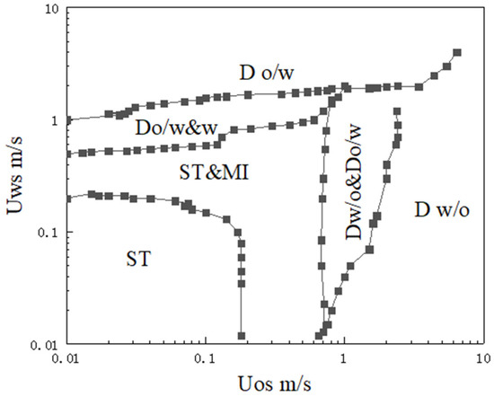 Multiphase flow is affected by many factors, such as the experimental environment, temperature, pressure, phase separation flow rate, pipe size, and fluid viscosity. Oil–water two-phase flow can be mainly divided into three categories, namely, stratified flow, dispersion flow, and dispersed flow, which can be further subdivided into six typical flow patterns, namely, stratified flow (ST), stratified flow with a mixed interface (ST&MI), dispersion of oil in water and water (O/W&W), dispersion of water in oil and oil in water (W/O&O/W), oil in water emulsion (O/W), and water in oil emulsion (W/O). The six flow patterns are shown in Figure 1. Trallero [8] derived six experimental flow patterns according to the phase separation velocity of oil–water two-phase flow in a horizontal pipeline, as shown in Figure 2.