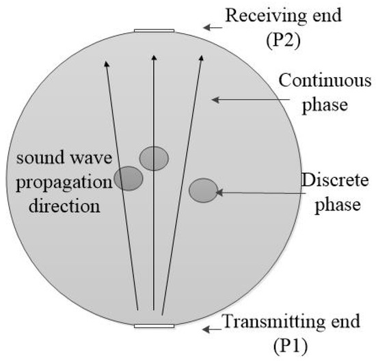 Acoustic testing methods mainly include the attenuation method [15], reflection method [16], and Doppler method [17]. A change in the oil–water two-phase flow pattern will cause amplitude attenuation and phase change of the received sound pressure signal [18]. Due to different acoustic properties propagating in oil phase and water phase, transmission and reflection properties of acoustic waves in the oil–water two-phase flow can present the relevant information of the change in the oil–water structure, namely, the flow pattern. A schematic diagram of ultrasonic attenuation measurement is shown in Figure 3. After ultrasonic absorption attenuation, scattering attenuation, and diffusion attenuation mechanisms in oil–water two-phase flow, the ultrasonic wave emitted from the ultrasonic transmitter reaches the ultrasonic receiver [19]. The ultrasonic attenuation coefficient is: