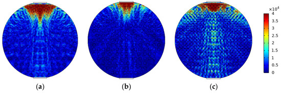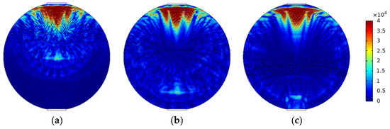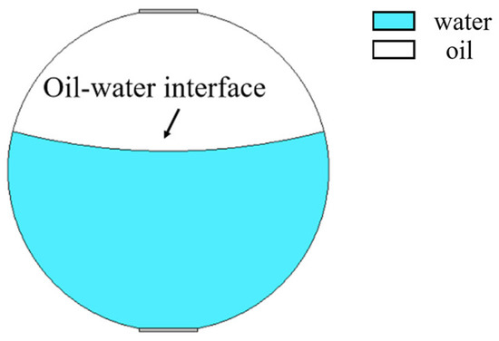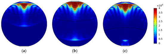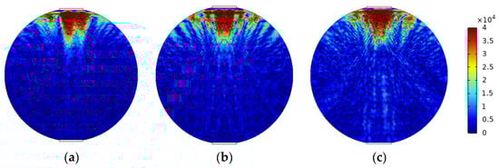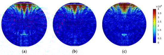 The mixed apparent velocity is an important factor affecting the formation of the flow pattern of oil–water two-phase flow [8]. At low mixed apparent velocity, the model of laminar flow resistance plays a primary role and the stratified interface is obvious. Under this condition, the flow pattern of stratified flow is formed. At a given mixed apparent flow velocity, the interface height decreases with the increase in oil phase fraction, and the oil–water interface curvature also changes with the oil phase fraction [20]. The model of ST flow is simulated in Figure 4. ST flow patterns with different oil fractions are represented by adjusting the position and curvature of the oil–water interface. Typical simulation results of sound pressure distribution of some ST flow patterns are shown in Figure 5, where the oil fractions are 20%, 40%, and 60%. In order to obtain sound pressure distribution in the whole pipeline, the simulation results take the moment about 3.4 × 10−5 s when ultrasonic waves reach the top of the pipeline. The parameter settings of simulation experiments described in the following section remained the same.