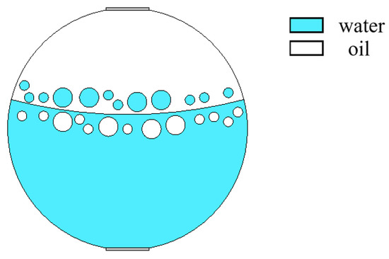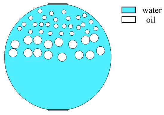 When superficial mixing velocity is high, oil and water fluids are fully mixed, and form characteristics of oil–water two-phase dispersed flow. The dispersed flow can be divided into oil-in-water-flow with water-based continuous phase and water-in-oil flow with oil-based continuous phase. When the water fraction of mixed fluids at the inlet is high, the oil phase is dispersed in the water phase, whereas when the oil phase fraction is high, the water phase breaks up and disperses in the oil continuous phase. The distribution of dispersed droplets from the bottom to the top of the pipeline has a certain concentration distribution gradient. With the increase in the superficial mixing velocity, the distribution of the dispersed droplets gradually becomes uniform. The phase fraction is changed by adjusting the density of dispersed droplets. The model of O/W flow is simulated in Figure 12, and typical simulation results of some O/W flow patterns are shown in Figure 13, where oil fractions are 20%, 40%, and 60%. The model of W/O flow is simulated in Figure 14, and typical simulation results of some W/O flow patterns are shown in Figure 15, where oil fractions are 70%, 80%, and 90%.